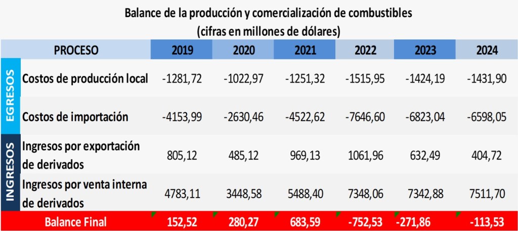 Después del análisis de tal información oficial, se evidencia que, en 2019, 2020 y 2021 la balanza cerró con superávit —152, 280 y 683 millones de dólares respectivamente—, es decir, no había subsidio; mientras que en 2022 y 2023, tras el impacto de los precios internacionales, se registraron déficits de 752 y 271 millones de dólares. Para 2024 el “subsidio” fue de apenas de 113 millones de dólares, un valor marginal dentro de una economía nacional de más de 100 mil millones de dólares.